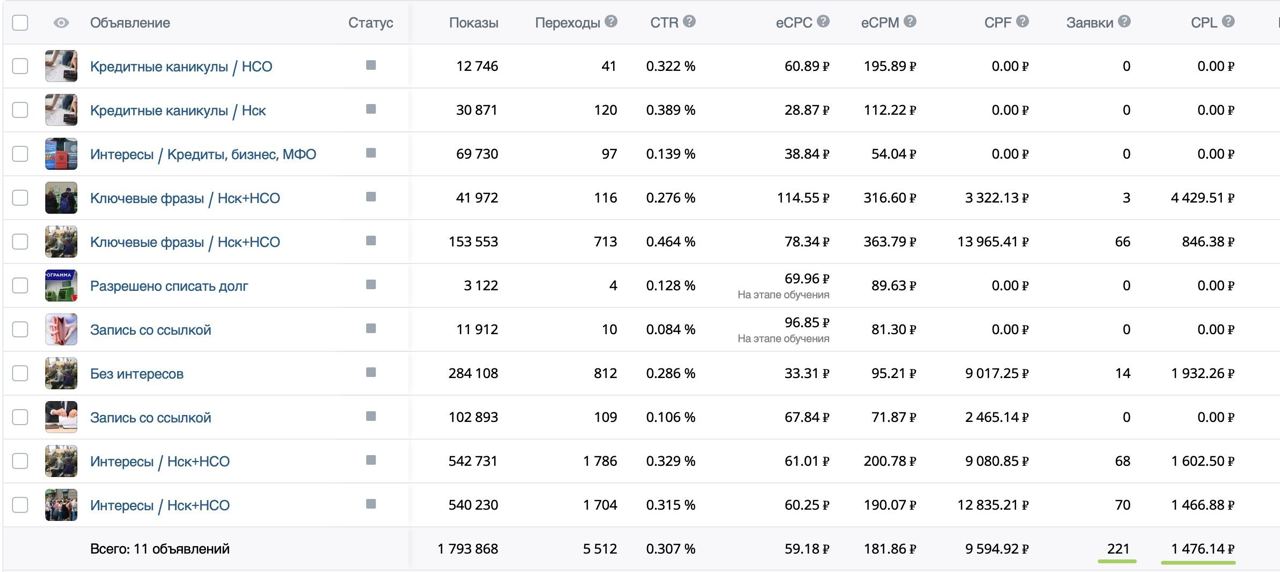 Лучше всего себя показали объявления, которые вели клиентов на лид-форму Vk. Мы постепенно отключали объявления, которые показывали худшие результаты, тем самым перераспределяли бюджет в пользу хорошо сработавших связок.