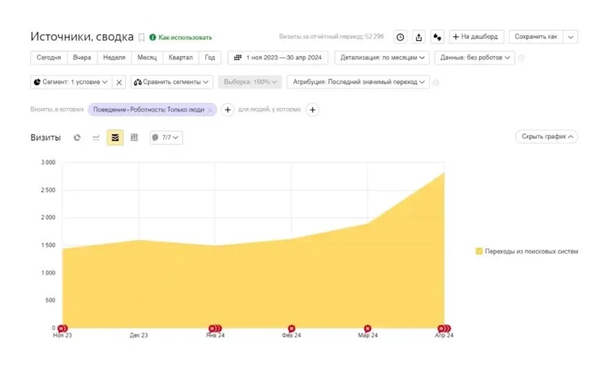Динамику количества лидов мы отслеживали через достижения целей в Яндекс.Метрике, и по нашим данным количество лидов в апреле 2024 относительно декабря 2023 (в ноябре были заведены не все цели) выросло на 47%.