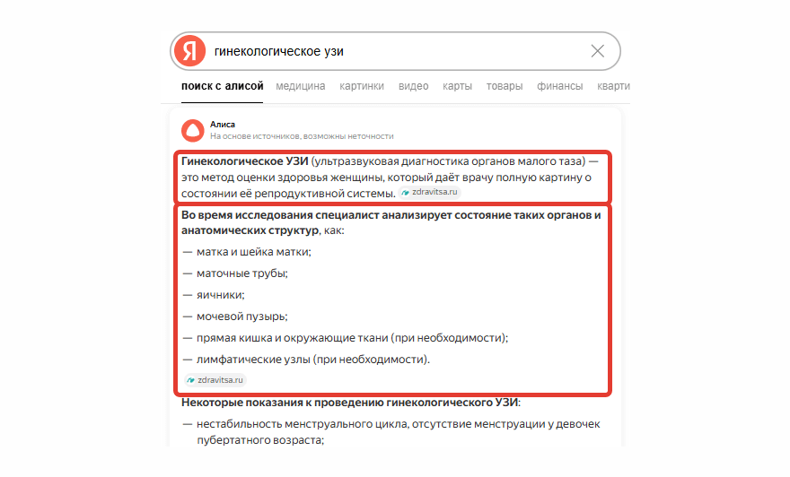 Пример нейровыдачи по запросу “Узи гинекологическое” в Google
